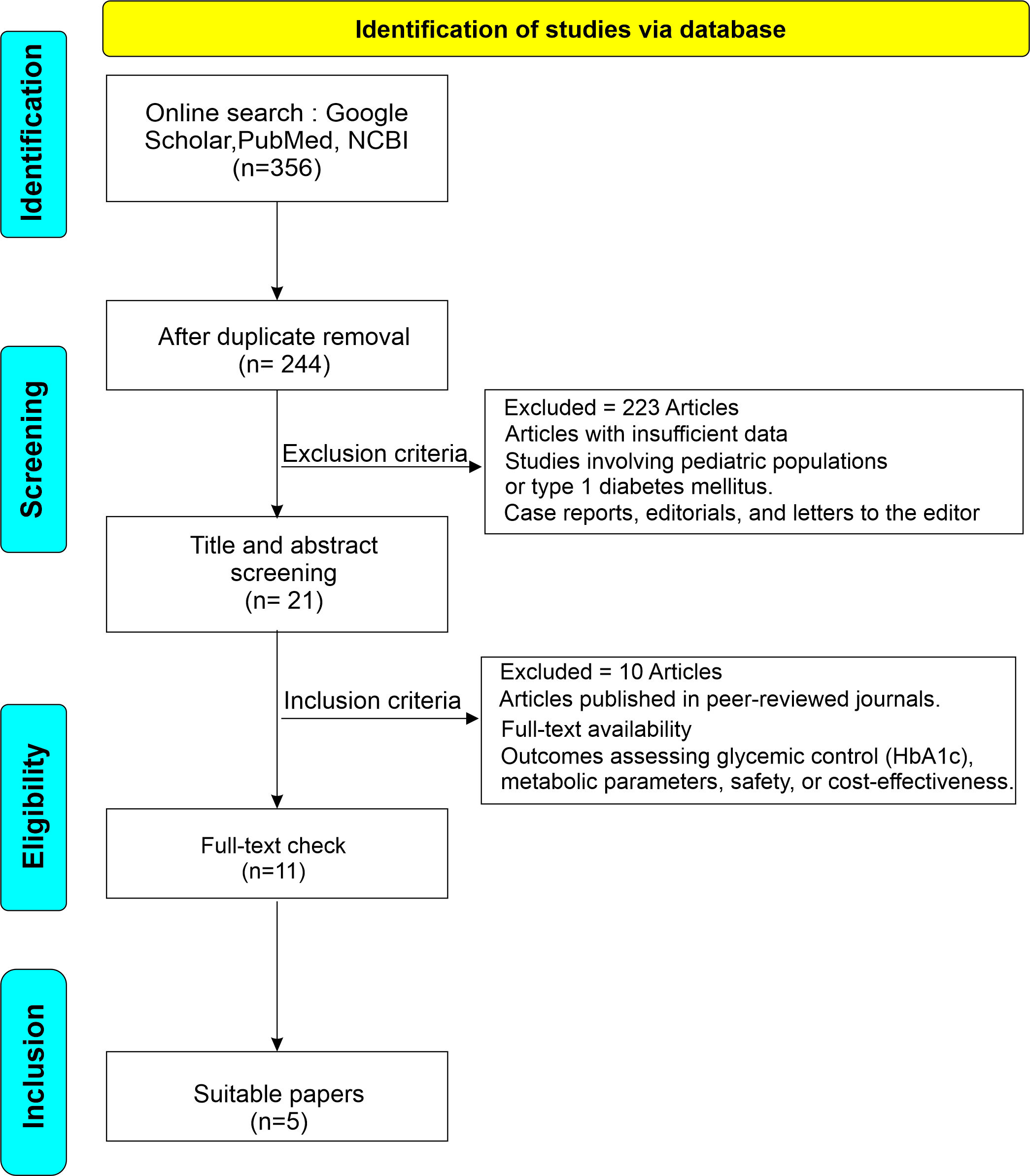 This review used an electronic literature search across PubMed, NCBI, and Google Scholar databases to identify studies comparing metformin, dapagliflozin, and their combination in the management of T2DM. The search was limited to articles published between January 2015 and March 2025 using the keywords “metformin, dapagliflozin, combination therapy, and type 2 diabetes mellitus”. Studies were included if they were published in peer-reviewed journals, assessed outcomes such as glycaemic control (HbA1c), metabolic parameters, safety, or cost-effectiveness, and were available in full text. Exclusion criteria included studies involving paediatric populations or type 1 diabetes mellitus, case reports, editorials, letters to the editor, articles with insufficient data, and duplicate publications. Five studies met all criteria and were included in the qualitative synthesis. The selection process followed PRISMA guidelines and is summarized in the flow diagram (Figure 1).