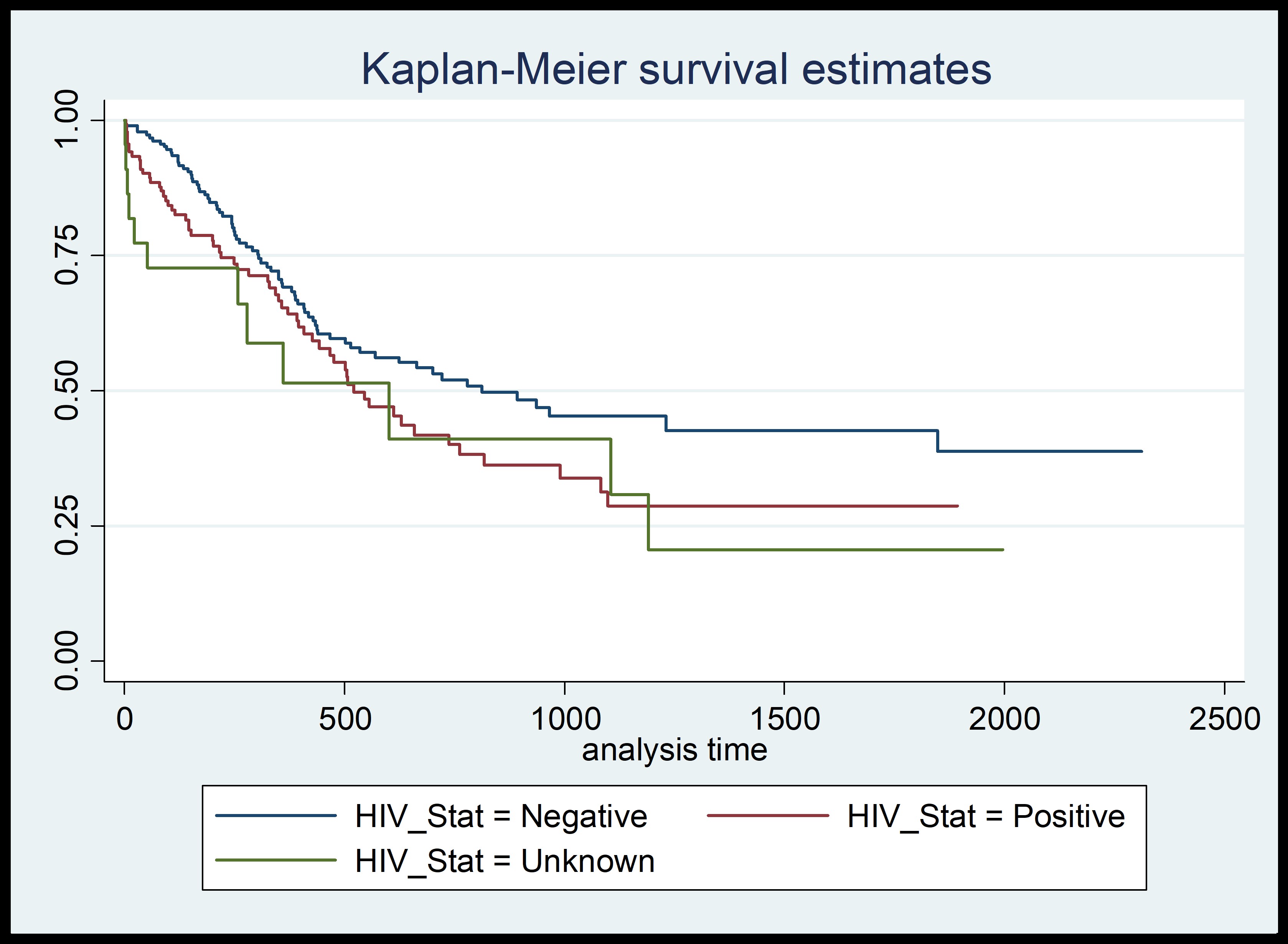 While the unadjusted Kaplan-Meier analysis showed a statistically significant difference in the survival outcome by HIV status, this finding was not supported in the Cox regression analysis (below), suggesting that HIV status alone was not an independent predictor of survival.