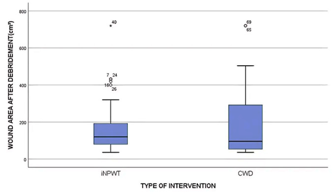 Figure 1. Distribution of wound area after debridement for iNPWT and CWD patients (box plot showing median, lower and upper quartiles, lower and upper adjacent values and outliers). * indicates outlier more than 3 IQR above upper quartile.