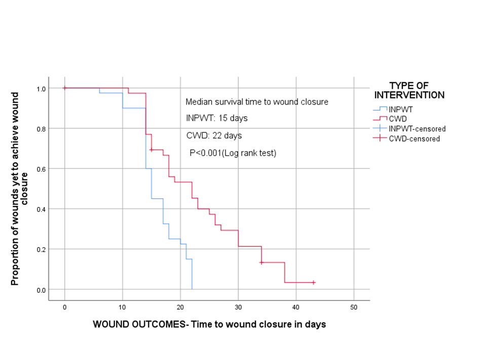 Method: This was a hospital-based, non-randomized study that involved eighty participants (aged ≥18 years) with abdominal wounds dehiscence (gapping) from two central Tanzania regional referral hospitals. Patients voluntarily chose to be treated by either iNPWT or CWD. The iNPWT was applied using the Chariker-Jeter technique and dressings were changed at 48-hour intervals before secondary closure. The primary efficacy endpoint was time until wound closure achieved by secondary suture within 42 days of follow-up and was compared between groups by Kaplan-Meier curve and statistical significance was confirmed by log-rank test.