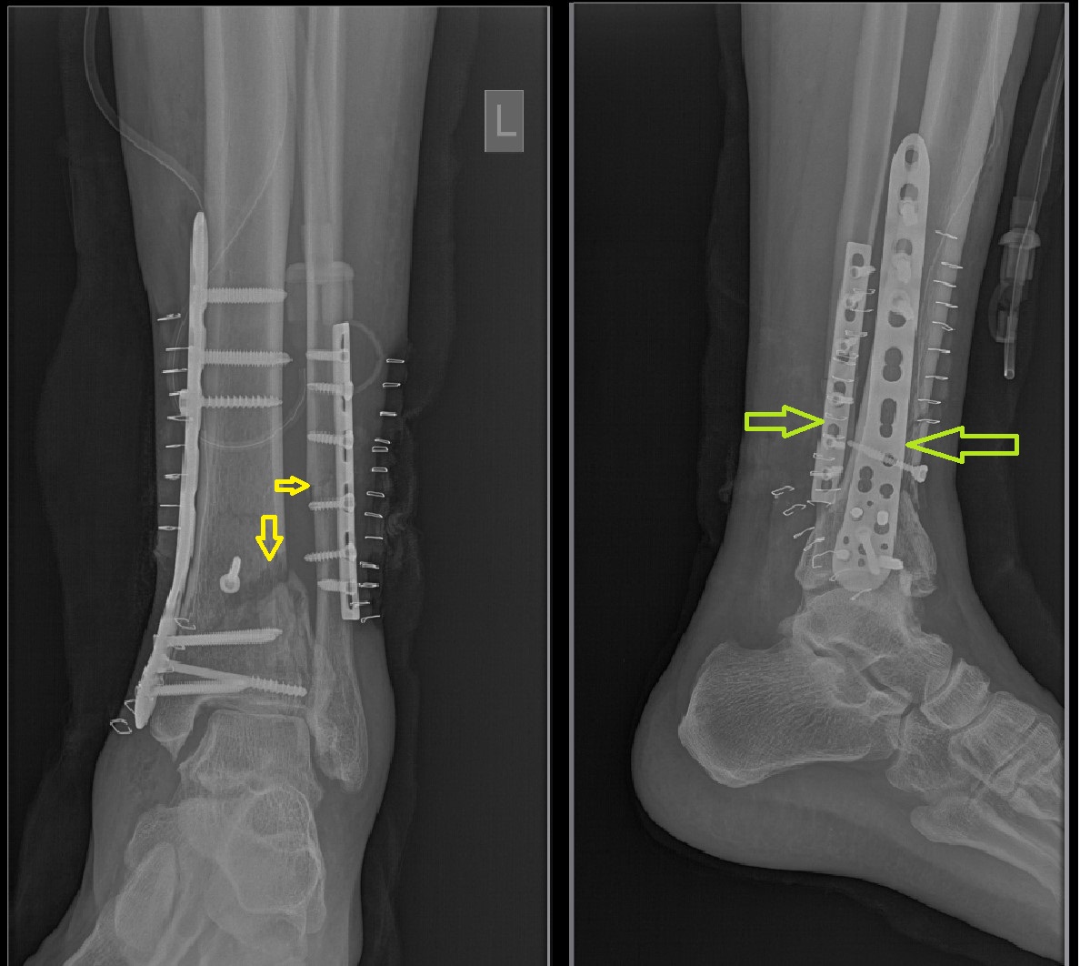 Figure 1. Anteroposterior and lateral radiographs of the left ankle demonstrating a comminuted fracture of the distal one-third shafts of the tibia and fibula, along with the postoperative status following open reduction and internal fixation (ORIF) of the distal fibula, showing satisfactory anatomical alignment and proper implant placement.