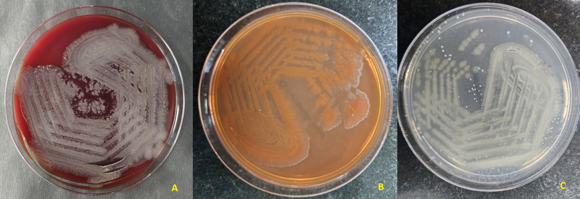 Figure 2. On 5% sheep blood agar [A], the colonies were non-haemolytic and ranged from grayish to white in colour; MacConkey agar [B] demonstrated the growth of pale, irregular, non-lactose fermenting colonies; and nutrient agar [C] showed smooth, grayish, non-pigmented colonies without any diffusible pigment.