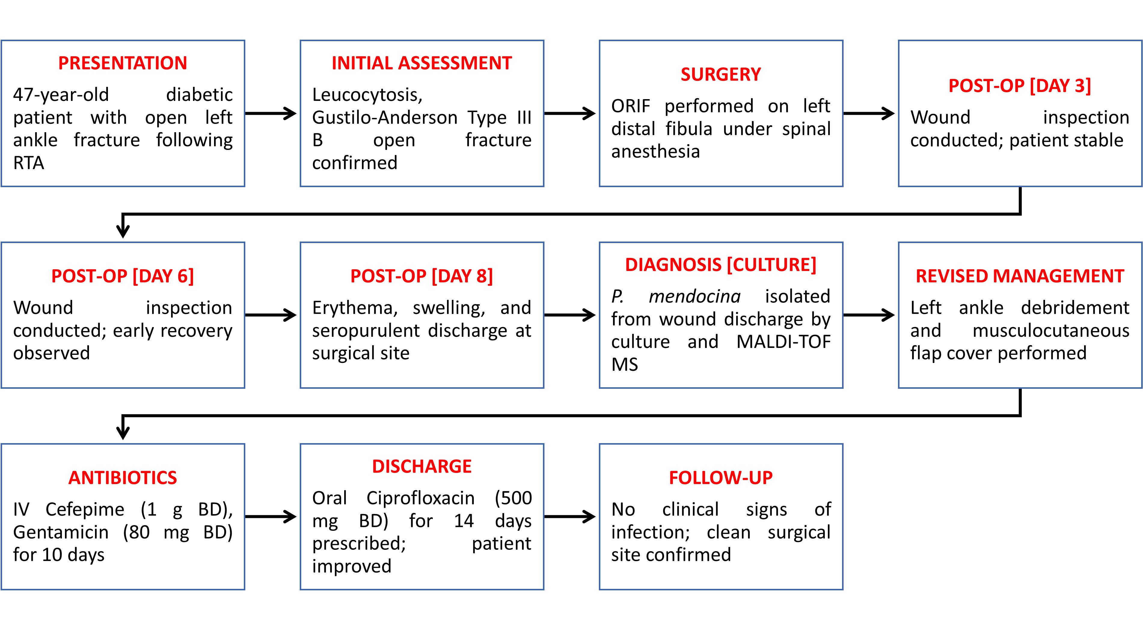 In view of the microbiological findings and based on the antibiotic susceptibility profile, the patient underwent left ankle wound debridement followed by musculocutaneous flap coverage. Intravenous cefepime 1 g twice daily and gentamicin 80 mg twice daily were initiated. Daily inspection of the wound and flap site was performed on postoperative days 3, 6, and 8, revealing progressive wound healing. The patient demonstrated steady symptomatic improvement, and the intravenous antibiotics were discontinued after 10 days of administration. Upon discharge, the patient was prescribed oral ciprofloxacin 500 mg twice daily for 14 days and advised to follow up in the outpatient department (OPD) after one week. At the follow-up visit, the patient exhibited no clinical signs of wound site infection, and the surgical site was clean with no discharge, indicating successful postoperative wound healing. No further long-term follow-up was performed as the patient did not return for subsequent scheduled visits. Given the retained metal-work, prolonged antibiotic therapy was considered before discharge to reduce the risk of recurrence, as is generally recommended. The clinical timeline of diagnosis, interventions, and outcomes is summarized in Figure 3.